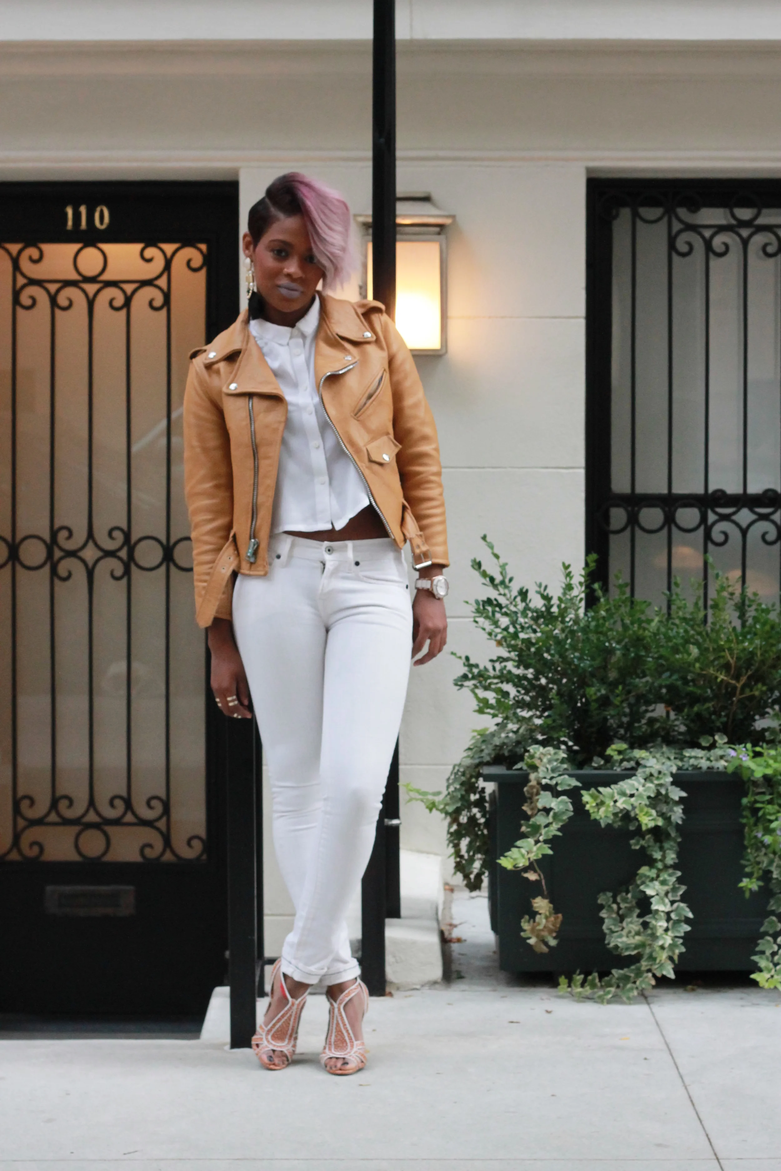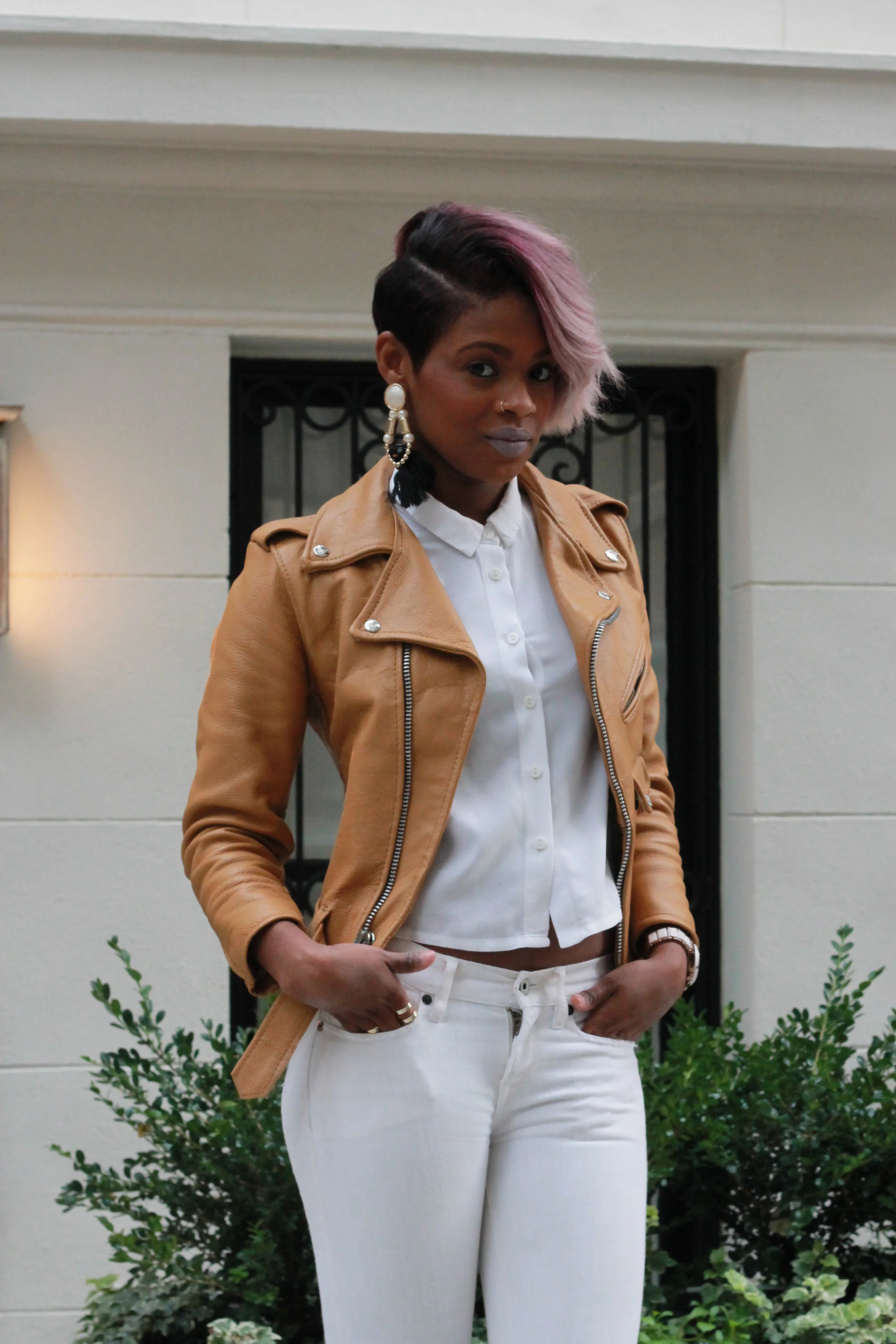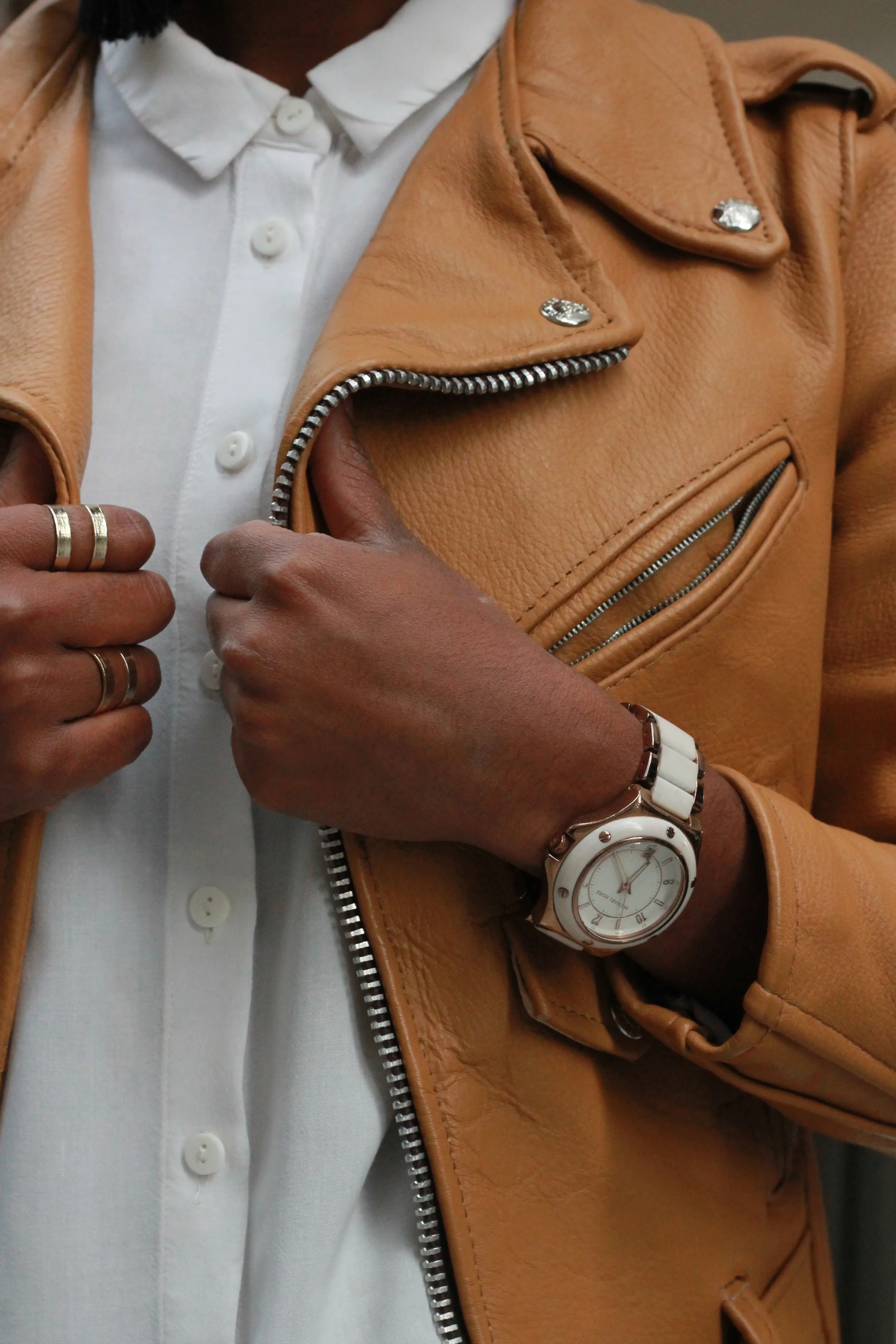 Thrifted Leather Jacket, H&M Top, Rugby Ralph Lauren Jeans, Charles Jourdan Shoes, Michael Kors Watch, Illamasqua Lipstick, and H&M Jewelry.