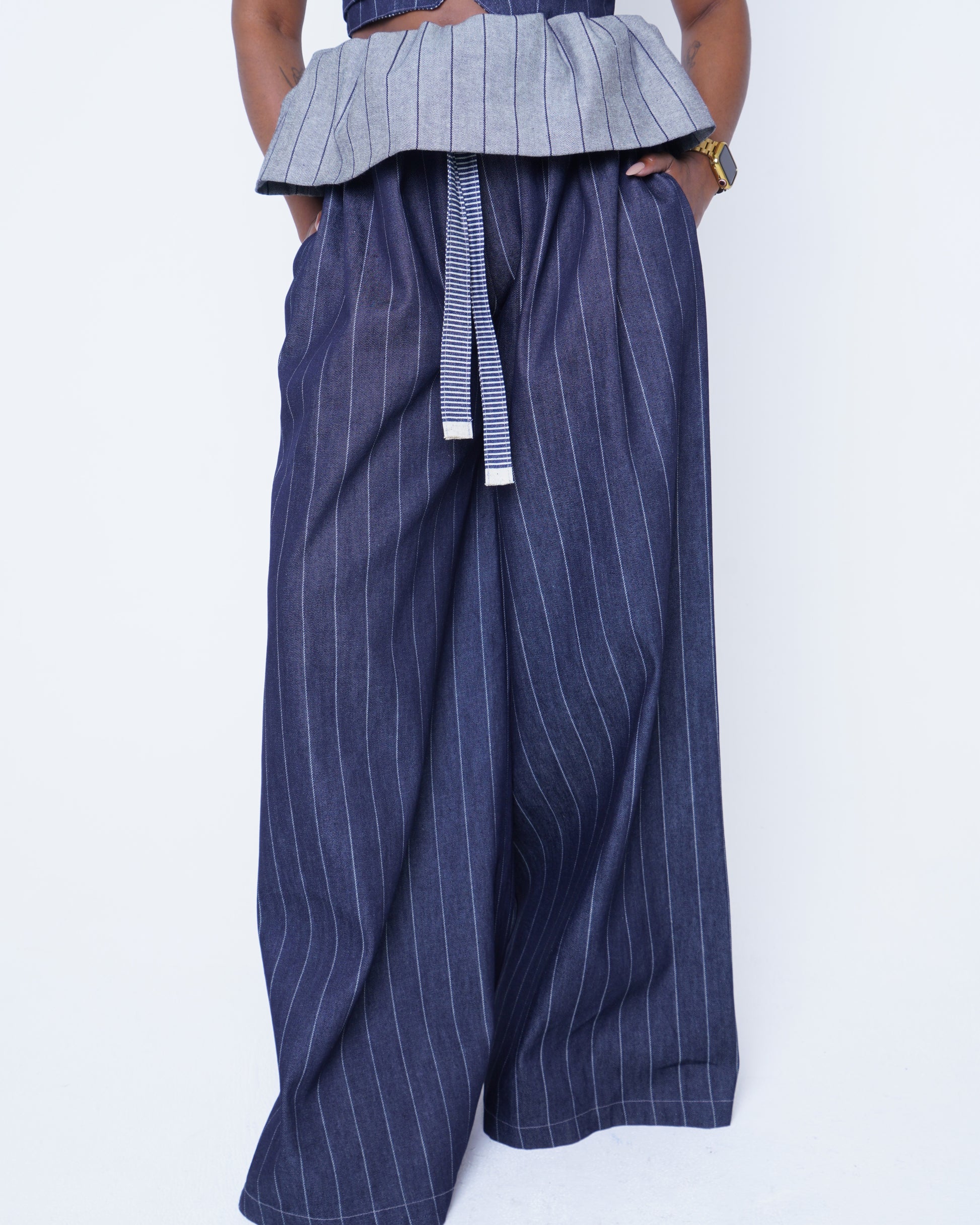 The Sly Paperbag Pant is giving the drama! Walk confidently and boldly with this pinstripe design and peplum flair. With the signature paperbag style, the pants naturally flow downward at the waist. What makes Sly one of a kind, is the hidden drawstring for cinching the waist for a seamless finish. The peplum and cinch at the waist emphasizes the wide leg design. Back pockets with the pinstripe going horizontally for a contrasting effect. Captivating and sexy! A part of our new exclusive Spring collection, WERK IT, quantities are limited.