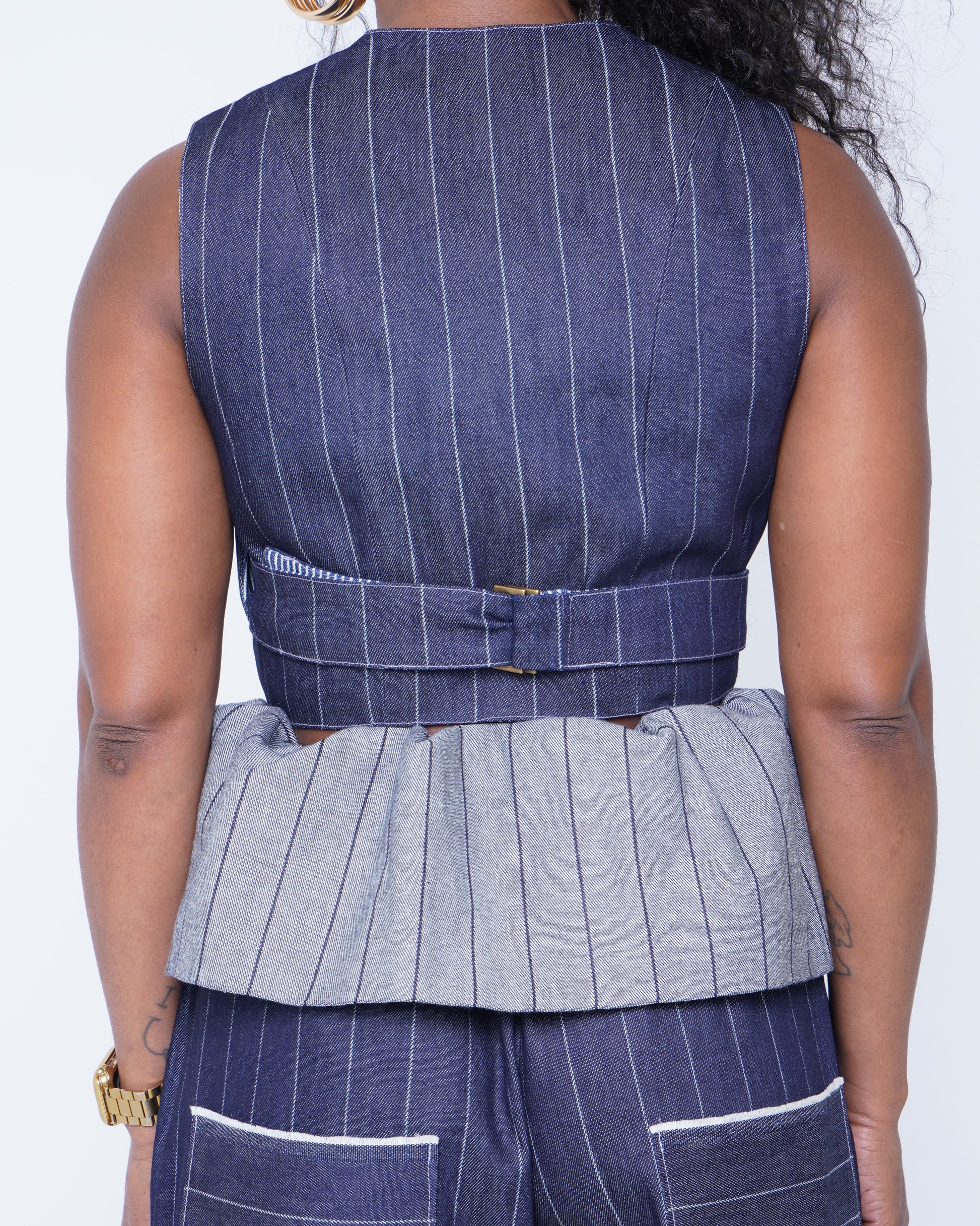 Embodying boss energy with the Silvia Wrap Vest. This vest is so sophisticated with the small pinstripe pattern, which compliments well with the Sly Paperbag Pant for a sleek look. The vest is reversible and adjustable with the wrap around closure in the back. Vests with buttons aren’t as flexible with busts, so the addition of a wrap around design allows you to adjust how much coverage you’d like while wearing the top. A part of our new exclusive Spring Capsule Collection, WERK IT, quantities are limited.