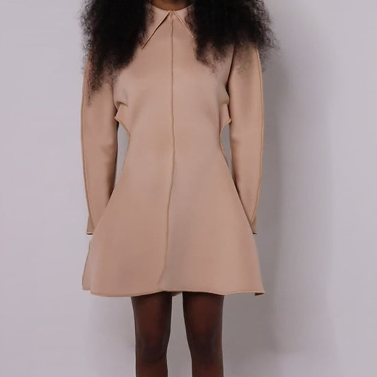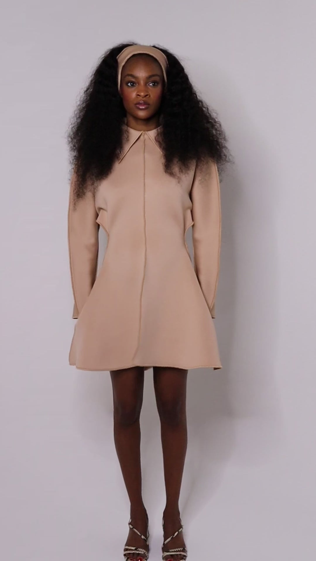 The structured collar adds a bold focal point, while the rounded puffer sleeves bring volume and balance, tapering at the wrists for a soft finish. A front-exposed seam runs vertically down the dress, subtly elongating the form. The hemline can also be cuffed to your desired length, offering added versatility.