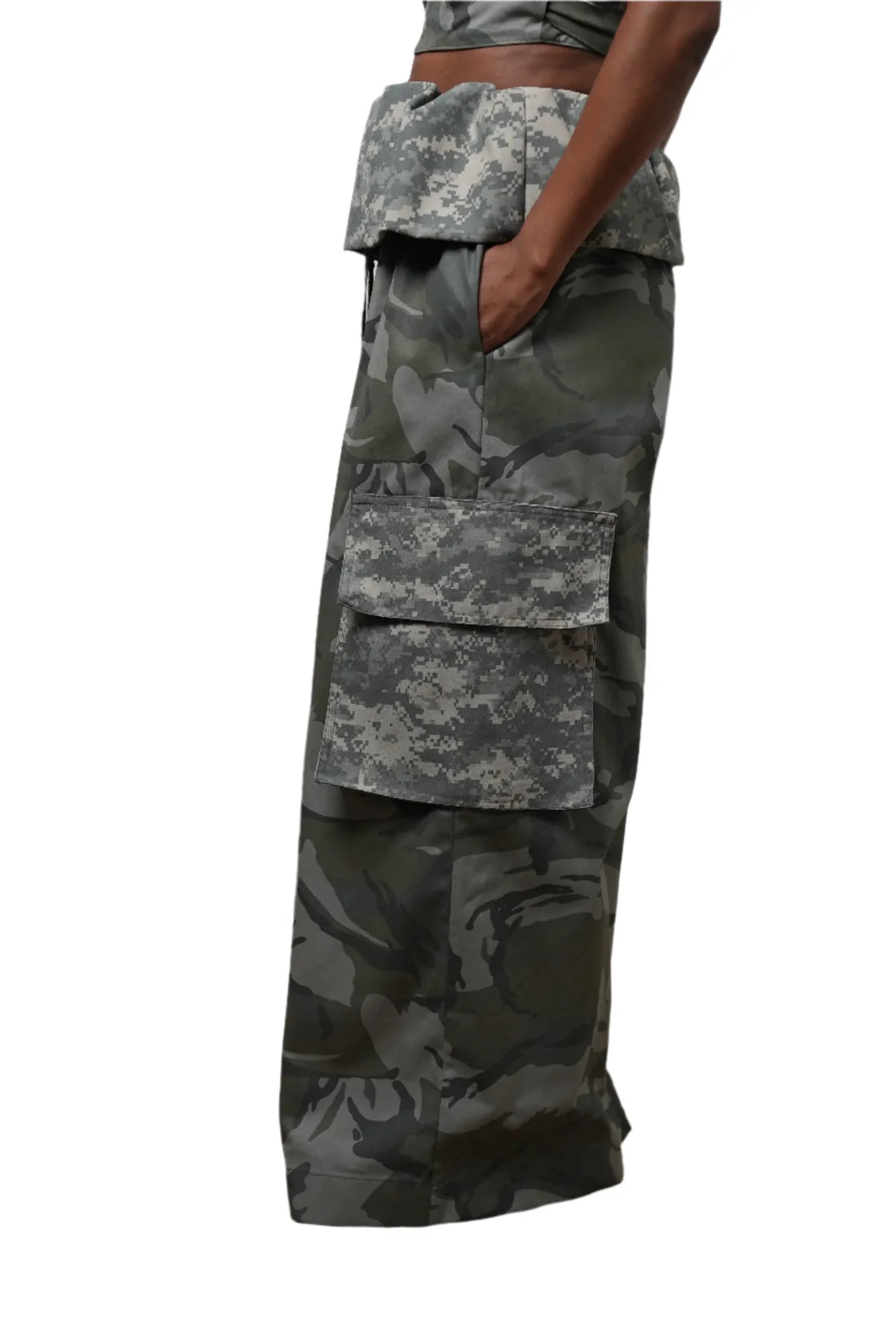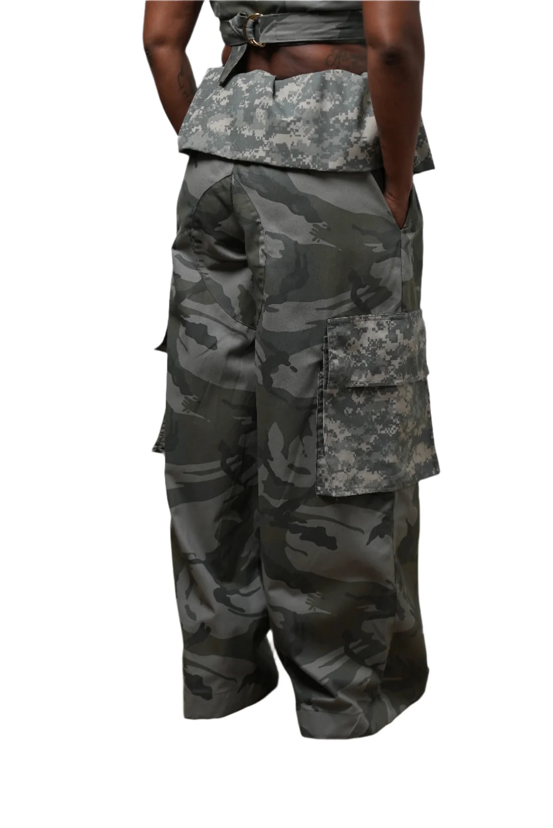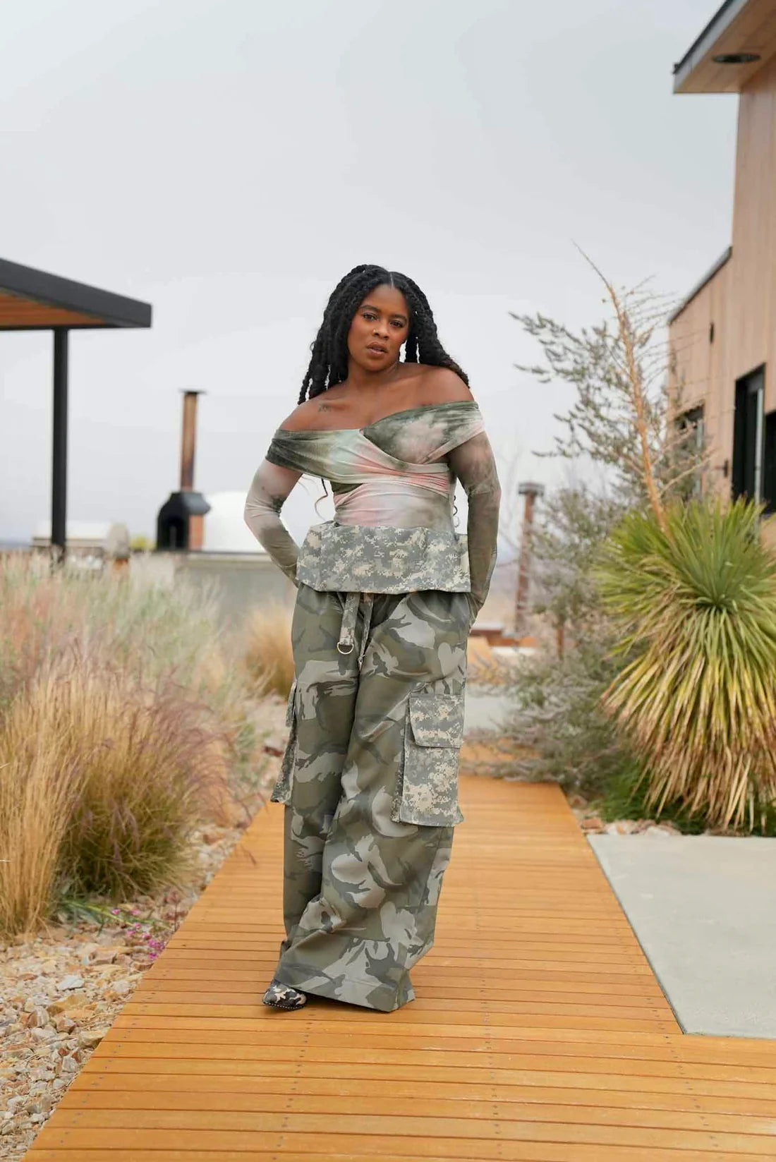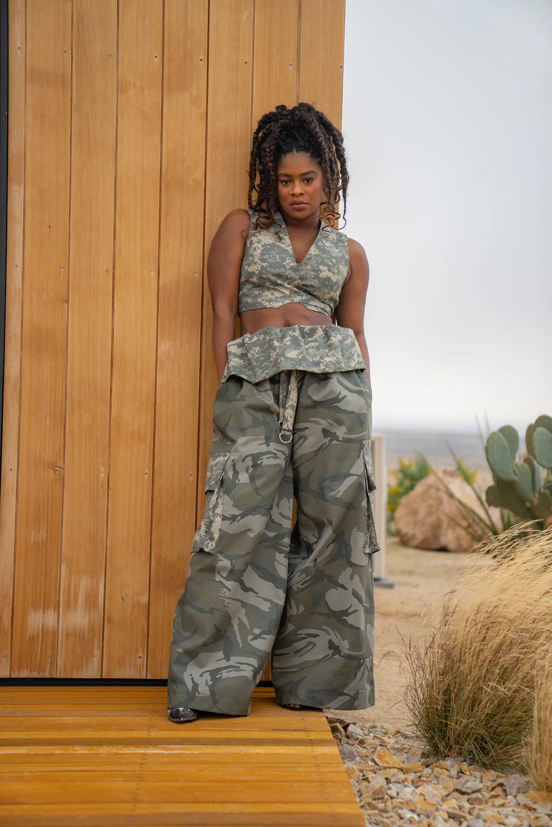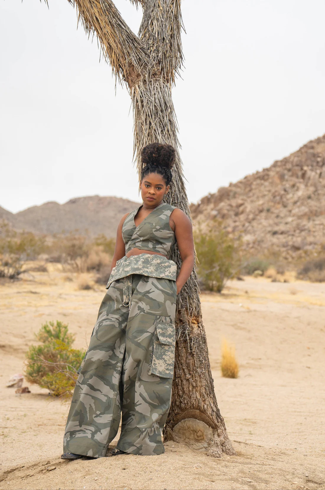 Introducing the Vanessa Paperbag Pant from the No Man's Land collection! If you loved the Sly Paperbag Pant, you'll adore the similar silhouette of the Vanessa. The waist features a stylish peplum detail with a playful mix of desert and digital camo on the pockets and inner fabric. Gold accents on the waist drawstring and deep side pockets add a touch of luxury. Plus, two sleek side pockets offer extra storage. Pair these with the Vaughn Wrap Vest for a complete, glam camo look.
