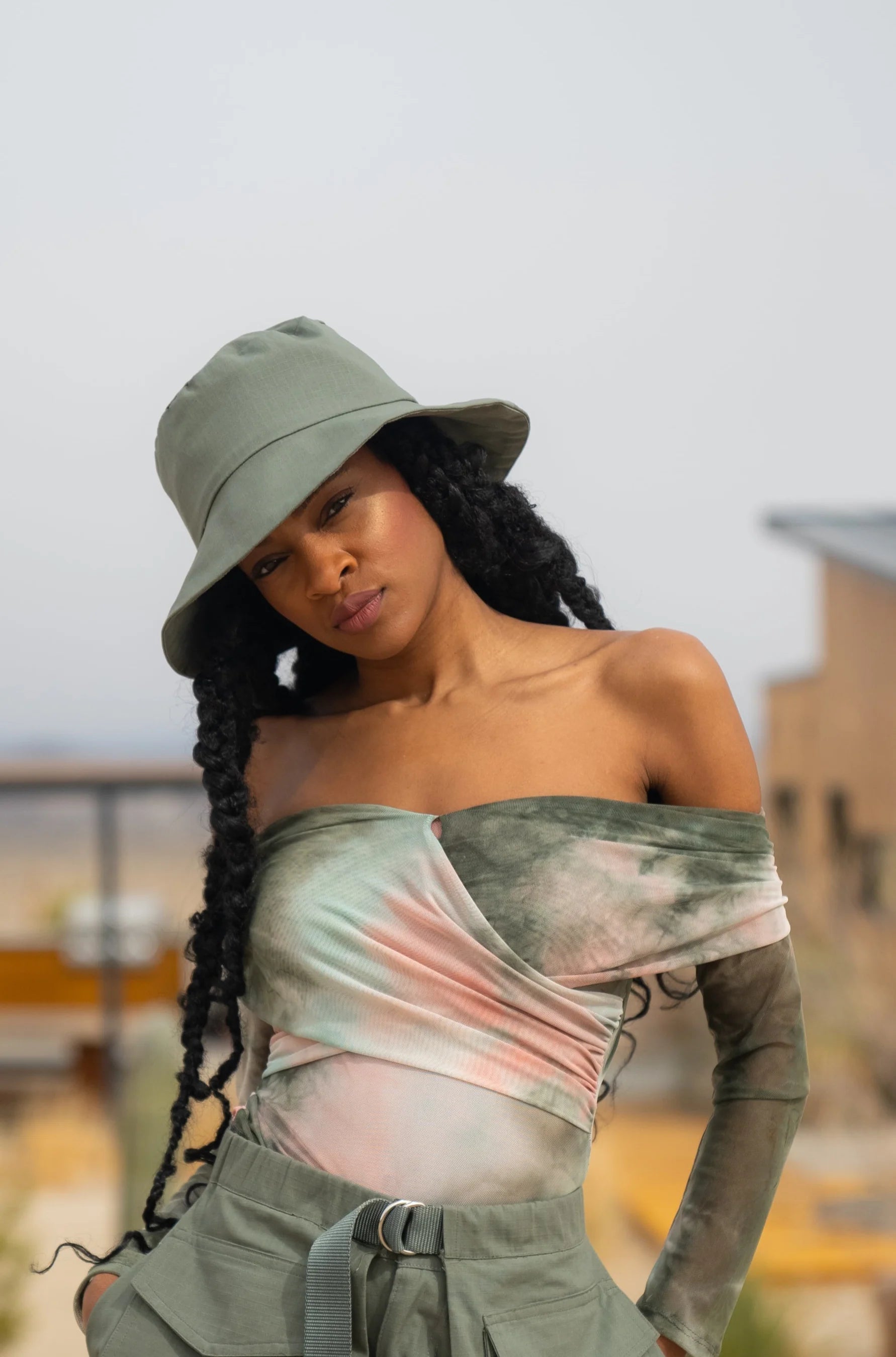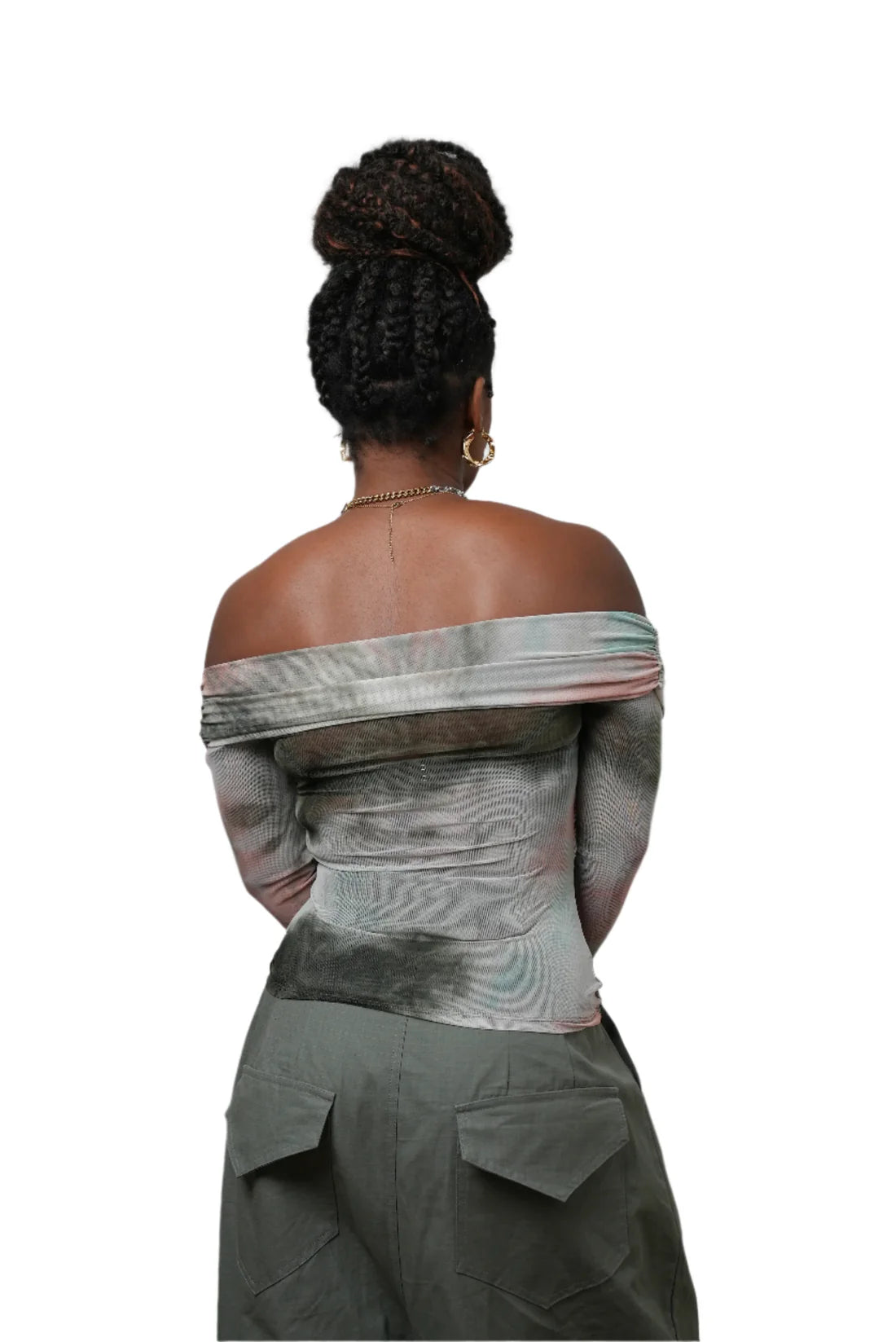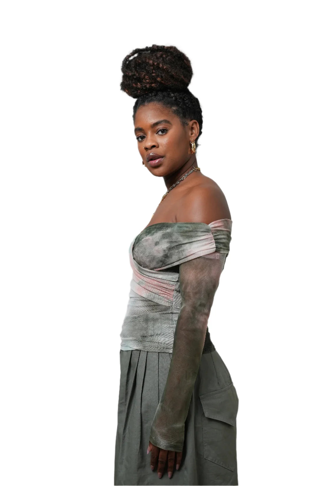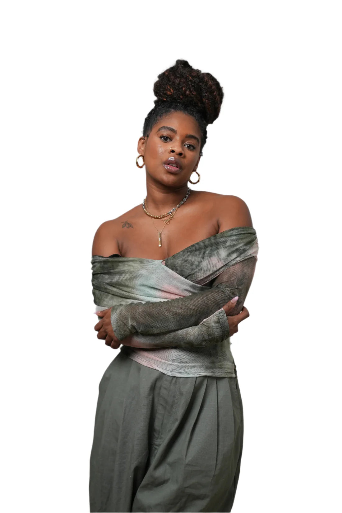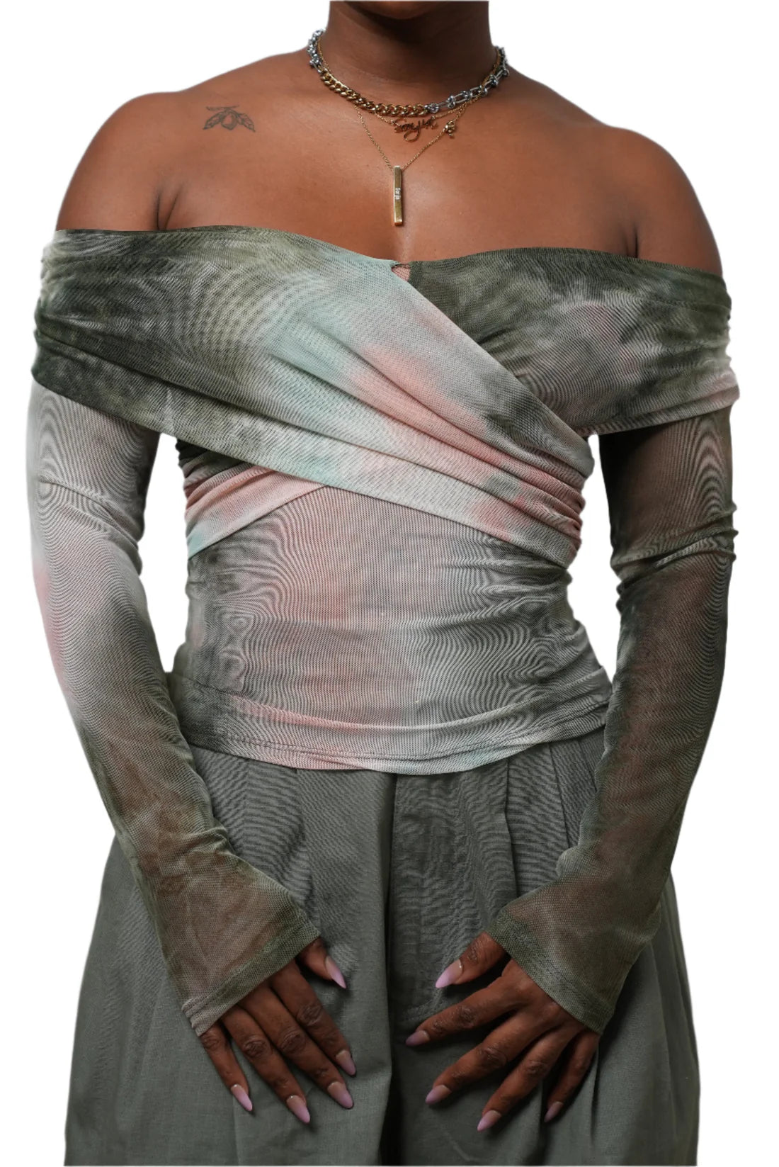Introducing the Valerie Off-The-Shoulder Top from our No Man's Land collection! This stunning top features a vibrant tie-dye pattern in shades of sage green and soft pink, perfect for a fresh, spring look. The crisscross off-the-shoulder design adds a feminine touch, complemented by fitted sleeves. Crafted with lightweight mesh detailing, it’s an effortlessly stylish piece that’s easy to layer. Pair it with the Victor Pleated Pant or the Vanessa Paperbag Pant for a bold yet soft ensemble.