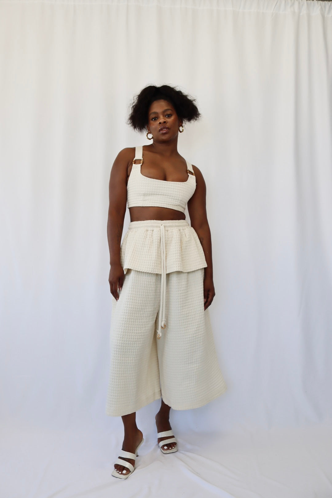 A soft peplum waist detail adds a feminine touch, complemented by a drawstring belt finished with bamboo tips for a natural, earthy accent. With slit side pockets and a relaxed palazzo shape, these pants are the perfect blend of style and function.