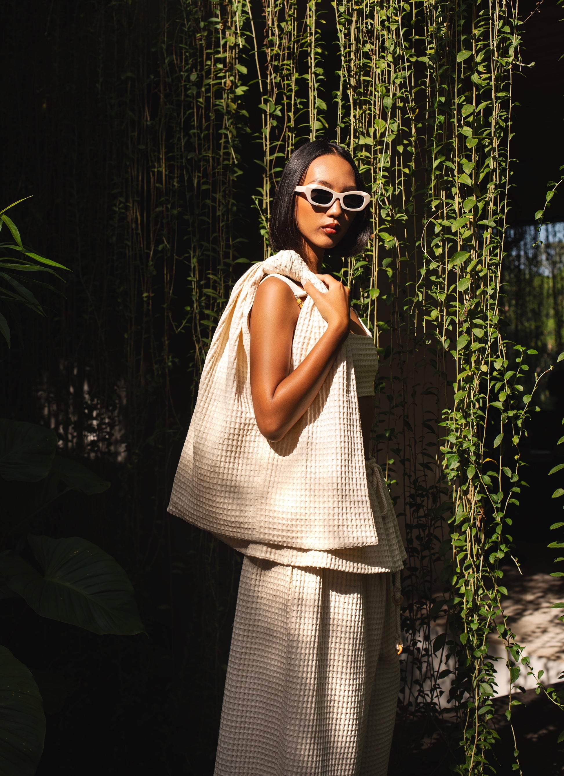 Breezy, elegant, and made for golden hour getaways — the Willow Pant brings vacation-ready ease with a polished twist. Crafted in a textured cream fabric, this wide-leg silhouette flows effortlessly while offering all-day comfort.