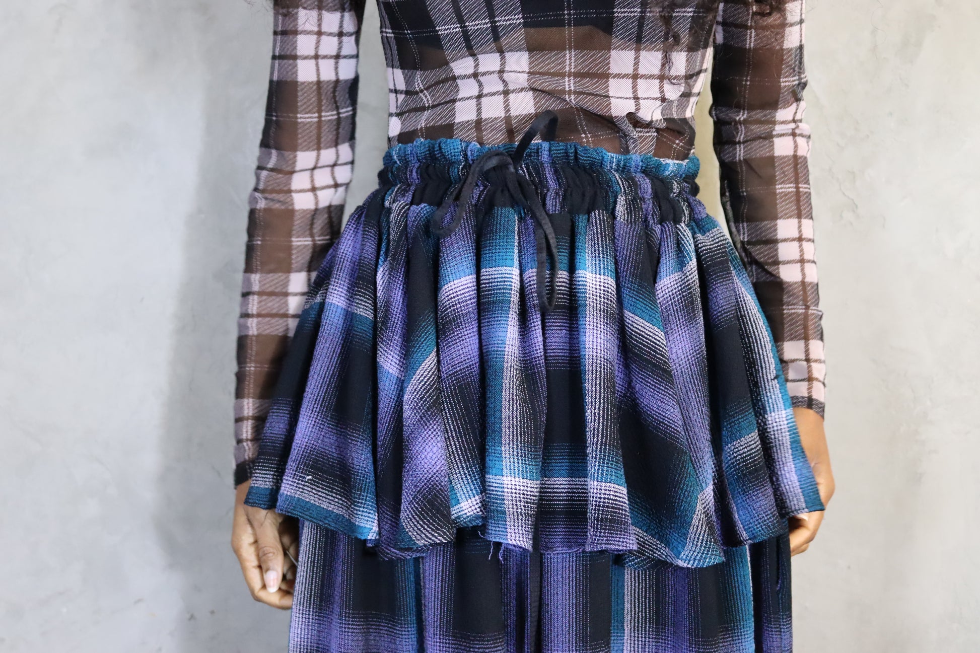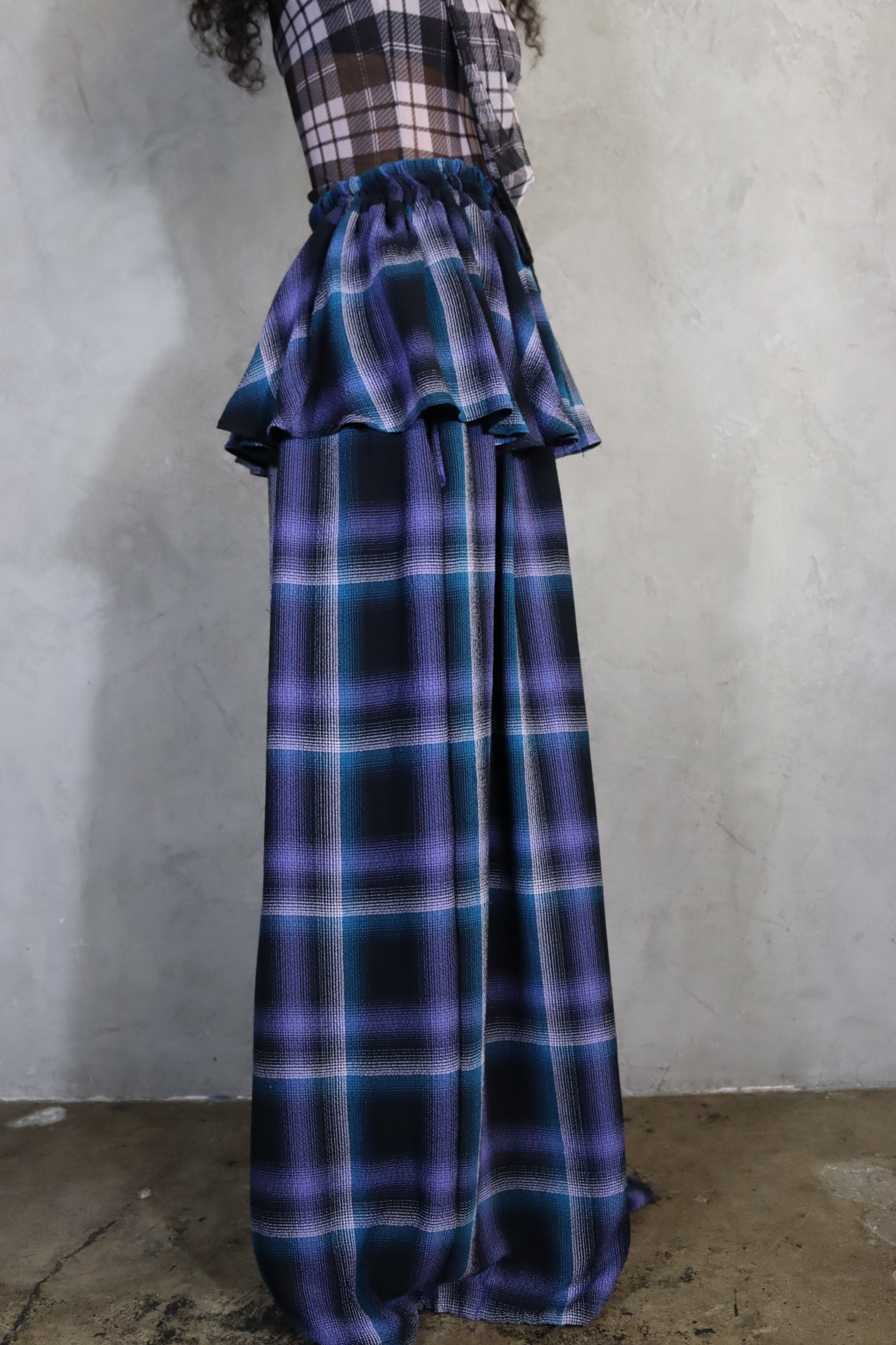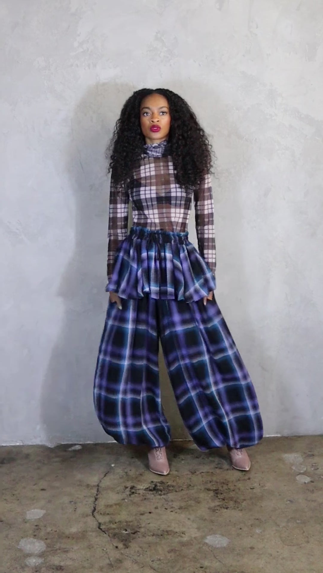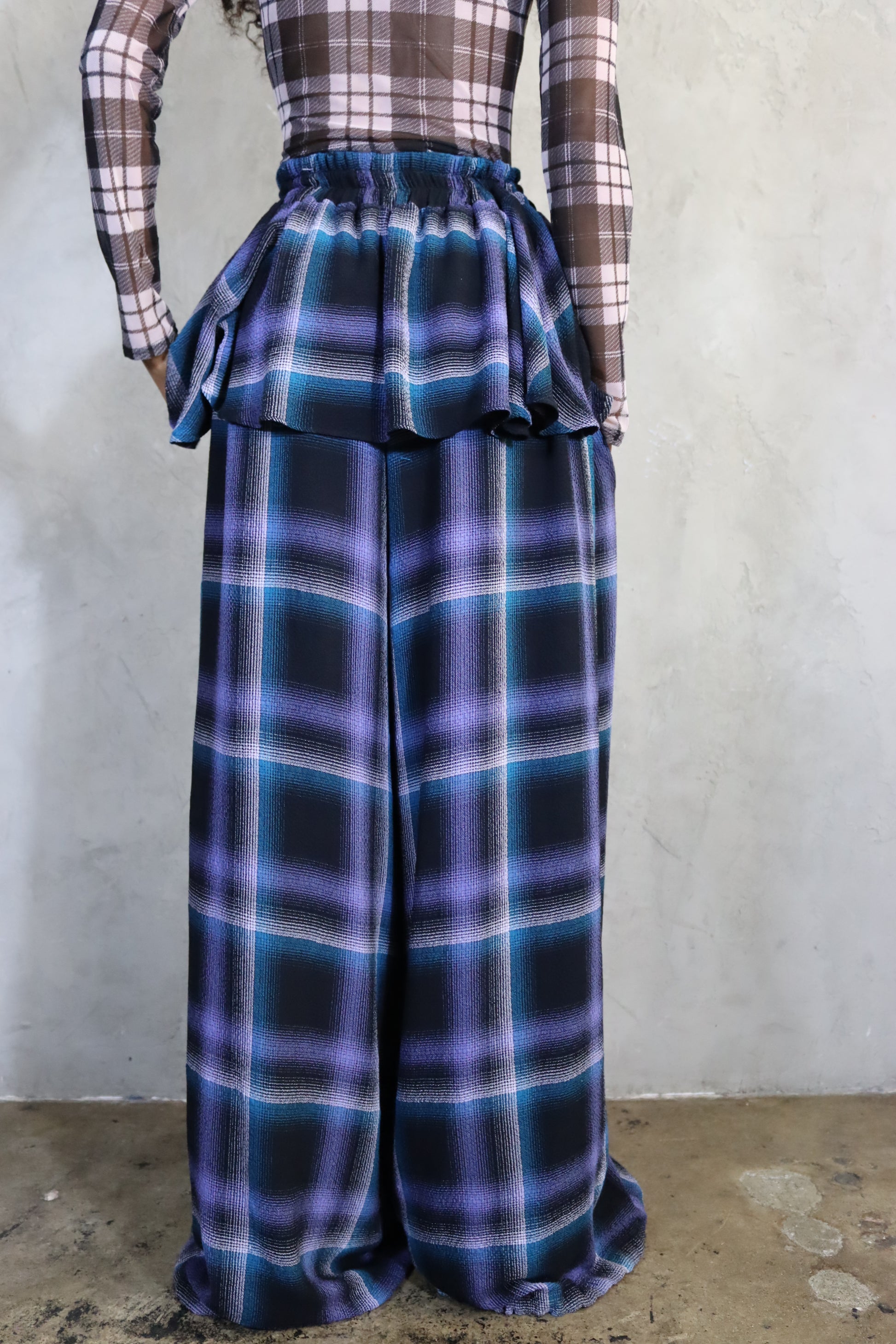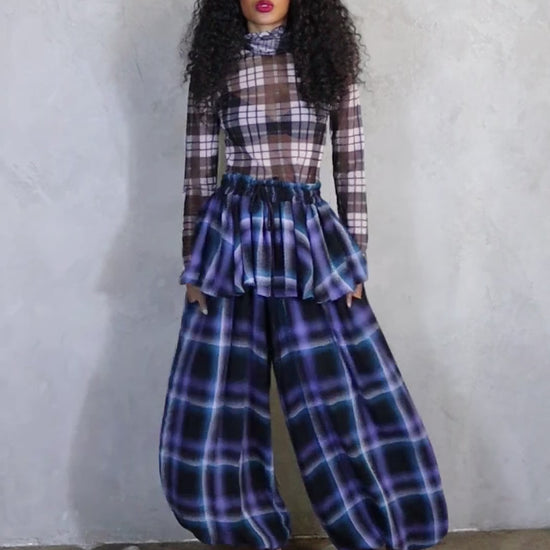 The Yohan Peplum Pant combines comfort and versatility with standout style. Featuring a bold large plaid in blue, black, and white, this pant is designed with a soft peplum overlay and practical side pockets. There is a lining in the pant for added comfort and warmth. A drawstring waistband offers a customizable fit, while adjustable hem ties let you wear it cinched like a jogger or loose for a wide-leg finish. Perfect for dressing up or down with ease.