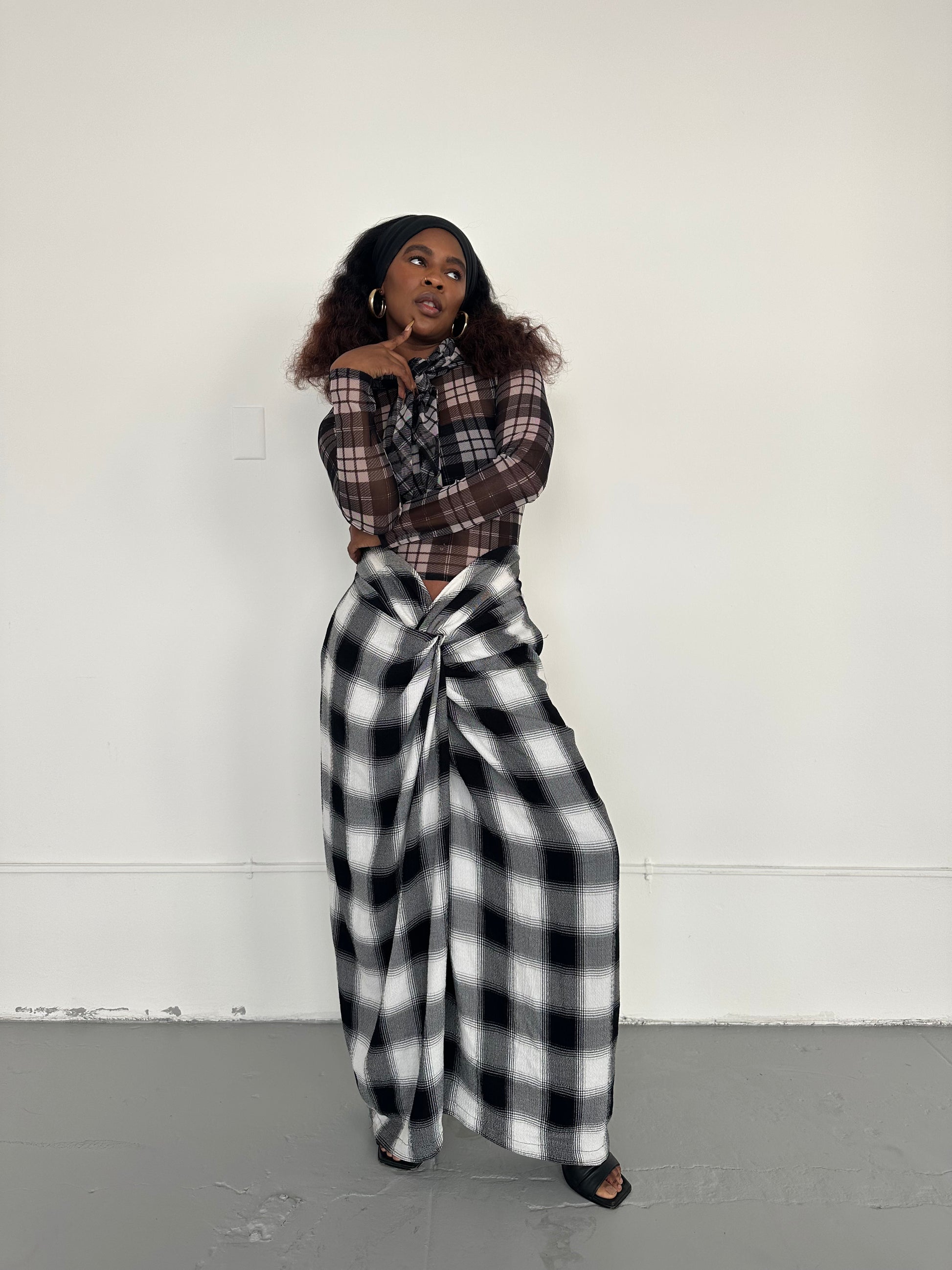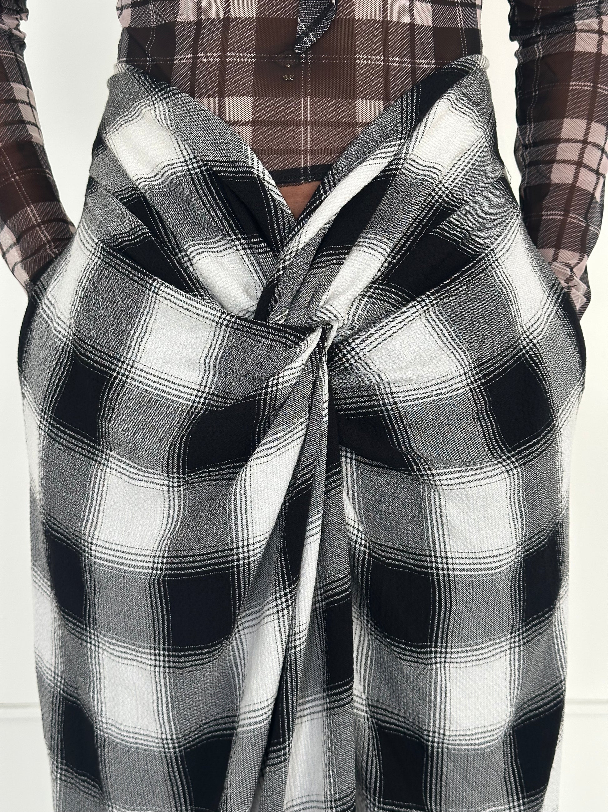 A modern twist on classic tailoring, the Yoshi Twist Pant is HERE in the Black & White Plaid you voted for! With its signature front twist that creates the illusion of a skirt, this pant balances avant-garde design with everyday ease. Thoughtfully crafted with two side pockets, a subtle drop crotch for relaxed structure, a hidden back zip, and a lined interior for comfort and warmth, it’s the perfect statement piece for those who love bold silhouettes with versatile style.
